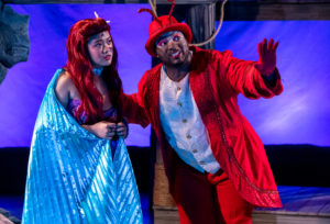 A special shout-out goes to the inventive Costume Design of Rachel M. Sypniewski. Having the task of designing costumes for numerous sea creatures who must sing and dance is not an easy assignment. Ms. Sypniewski does it with flair and panache. Two of my favorites were the “electrifying” outfits for Flotsam and Jetsam (Ursula’s eel sidekicks) and Scuttle the Seagull’s orange spats covering his tap shoes for his “Positooovity” number. This show has a large cast, and it takes many behind-the-scenes people to bring the show to life. Kudos go to Co-Directors Joshua Castille and Stacey Flaster (Ms. Flaster is also Co-Choreographer with Matthew Weidenbener), Co-Sound Designers Eric Backus and Jonesy Jones, Stage Manager Erin Nicole Eggers and Music Director/Conductor Celia Villacres.
