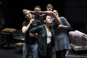 The ominous tale nicely resolves with an ending that is both haunting and meaningful. However, as the characters ruminate about their horrific predicament, certain operatic laments about mundane life, such as requiring deodorant and copulation, left me flat. I also wasn’t too pleased about watching routine bodily functions at the very beginning with the father urinating into the toilet at the same time as the homeless dog-man is doing the same on their lawn. Was that a portend of things to come? Of course, the point was to draw parallels between the two men: what one is and what one will become. The performance also shows us how people try to retain some sense of normalcy in lives punctuated by degradation. So when the two teenage sons (played by Pablo David Laucerica and David Fleming) look at porn magazines and when the pubescent Lisa looks at herself in the mirror and sees herself as becoming a young woman, these moments of healthy sexuality help to counteract some of the grim realities being depicted.