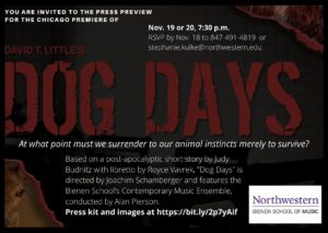 Currently premiering at the Ryan Opera Theater at Northwestern University is “Dog Days,” the first collaborative effort between Northwestern’s Institute for New Music and the opera program at the Henry and Leigh Bienen School of Music. “Dog Days” is a one-of-a-kind opera, a disturbing, shocking, and gritty story of survival that is not easy to watch. The genre is post-apocalyptic horror, and the libretto by Royce Vavrek is based on Judy Budnitz’s dystopian short story by the same name from her 1998 collection Flying Leap.
