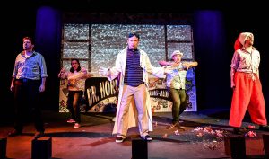 Kevin Webb is outstanding in his role as Dr. Horrible, an aspiring villain. He holds the story together with his marvelous singing and his wide ability to engage the audience with his patter and humor. Equally fine voices belong to Tommy Thurston, who plays his archnemesis Captain Hammer, and Stephanie Fongheister, who plays Penny, a charity worker who is both men’s love interest. The competition between them for her affections is swift and unyielding. Their songs create the engine for much of the show, thanks to excellent music direction by Micky York. In addition, Joshua Servantez, as Moist, and Caitlin Jackson, North Homewood, Josh Kemper, Peter Ruger, and Maiko Terazawa round out the cast.