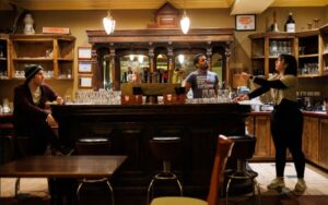 Although this is a site-specific play relating to a bar, this is not immersive theatre. While the audience is indeed sitting in a real public house (and a lovely one at that), the fourth wall is never really broken. In other words, the audience is not involved in any of the vignettes nor do we interact with the actors. All throughout, we hear recordings on the sound system in the background: Pink Floyd, Led Zeppelin, Johnny Cash, etc. This only adds to the realism. The music is being played at the correct volume so that it doesn’t detract from the words being spoken. Casual costume design by Rin Menge works well for this production.