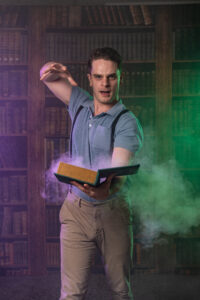 You begin with a sticker in your program identifying the player with whom you will be associated. Don’t turn off your phones. You will be voting on a variety of choices or responses. The browser-based voting software, designed by Gamiotics, is smoothly integrated into the production, and more importantly, it’s bug-free. Sometimes you are voting on what you want the actor to do. Or your reflexes will be put to the limit as the audience collectively taps their phones just enough to beat a challenge within a set timeframe without going over a certain limit. (That’s not as easy as you might think.) And there are challenges, which you will flunk if you are not paying attention. There is a lot of randomness so things have the potential to go hilariously wrong given the crowd’s crazy decisions and call-outs. There are big events, too, where the actor will be required to roll a giant 20-sided die on stage. Depending on the response from the audience, they can give the actor a bonus to their roll or penalize them.