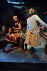 “Eclipsed” takes place in a rebel army camp during the Second Liberian Civil War in 2003. The action plays out on a single-unit, sparsely furnished set, winningly designed by Jacqueline Penrod and lit by Megan Turnquist. Three women occupy a small living area in the camp, all of them prisoners held by a ruthless rebel commander. They have been stripped of everything they once were — completely without an identity — reduced to calling one another by the number representing the order in which they were captured. Wife #1 (Maya V. Prentiss) seems to be the eldest and also the one who has naturally become the protector of the rest, cooking the meals, cleaning the squalid shelter and caring for the pregnant Wife #3 (Aja Singletary). They have been hiding a 14-year-old child, The Girl (Sola Thompson) for a short period of time but it’s not long before she is discovered by the commander and made Wife #4. With their daily activities limited in confinement, they spend most of their free time interacting with one another and their sole purpose is to be available to satisfy the commander’s sexual gratification when they are summoned, based on which “wife” he may happen to be in the mood for that day. As small provisions are delivered, the three bicker over who will get what clothes or small amounts of food. Included in one parcel is a book, which is only of value to Wife #4, as the other two are illiterate. In the evenings, she reads aloud and entertains them with the story from the book, which is a biography of a recent U.S. President. While Wife #2 (Adhana Reid) is merely mentioned in passing, we discover that she has been absent for quite a long time. Eventually, she returns to the camp, but does not stay with the other three. She has been busy fighting as a rebel, recruiting more young women to join the revolutionary cause and training them for combat with firearms. Also making random appearances at the camp is Rita (Morayo Orija), an educated mother working for a global peace organization who is searching for her lost daughter in all of the local camps. As information is exposed in layers, and long-kept and deeply buried secrets are revealed, we finally learn the first names of these strong and resilient women.