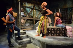 Most of Act One consists of just Prentiss, Singletary and Thompson on stage together, and it is very clear that they have developed an extremely tight bond as an ensemble. Prentiss is wonderful as the world-weary and pragmatic Wife #1. She shows glimpses of both deeply embedded sorrow as well as a nurturing spirit, exemplified when she aids Wife #3 in grooming her frizzy wig. Singletary is ebullient as Wife #3, filled with joy and overflowing with hope for her unborn child. She is given the bulk of the script’s comical moments and makes the most of  her humorous portrayal. Thompson turns in a fierce and transformative performance as The Girl, so open and concerted initially but swayed by hatred and self-preservation once she has become #4. It is a chilling performance, galvanic and devastating, illustrating the horror of how quickly innocence and goodness can be subverted and destroyed. Her monologue in Act Two is completely mesmerizing. All three of these fine actresses maintain impeccable accents throughout (Carrie Hardin is the Dialect Coach). If Reid could dig just a little bit deeper her Wife #2 would be truly terrifying. She is certainly threatening and hostile, but adding more of an authoritative and deadly edge to her performance would be a nice contrast to the cascading silver spangle earrings and blood red Harley Davidson shirt she sports (costumes designed by Owe Preye Engobor) as she brandishes her AK-47. Hopefully, Reid will tap into that inner beast as the run of this show progresses.