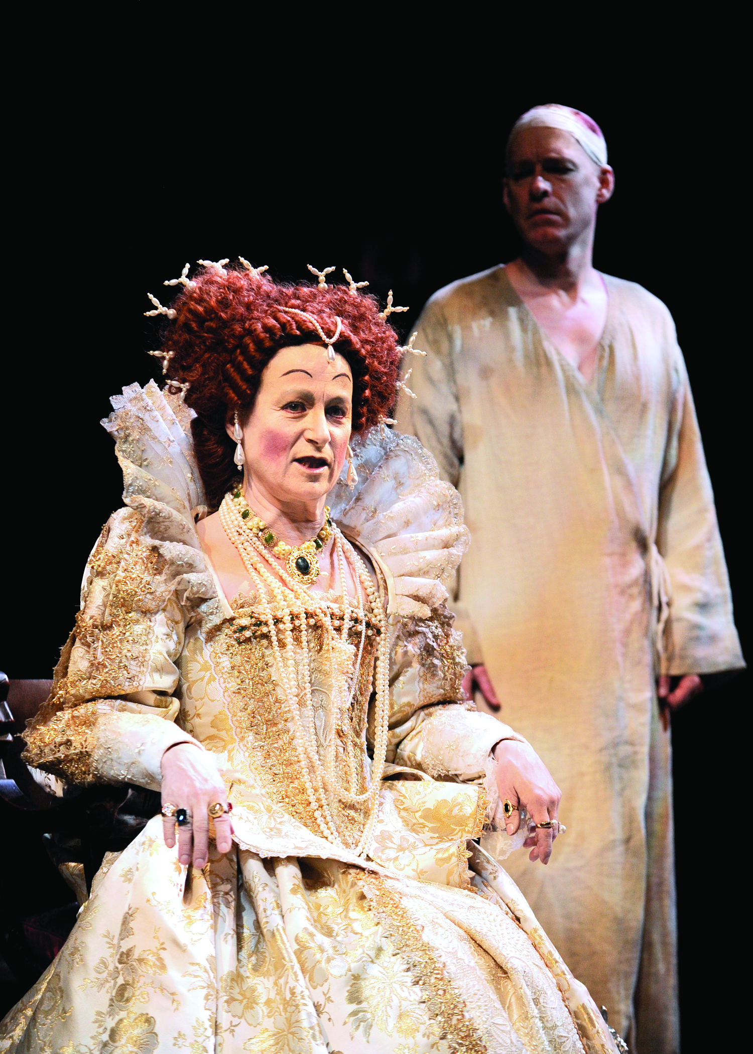 Recommended***For those of you who are not regular visitors to the Chicago Shakespeare Theater on Navy Pier, it is NOT just Shakespeare on their Courtyard stage, but is always quality theater. Their current production, “Elizabeth The Rex” written by Timothy Findley is a fictional drama based on some historical facts, although, not very well known. Supposedly, Queen Elizabeth ( a powerful portrayal by Diane D’Aquilla) is about to witness the beheading of her lover, the Earl of Essex, for his act of treason. She commands that the men of the court perform a play. Due to the situation, there are thoughts that rioting might take place and thus the actors are lodged that night in the royal stables ( a dynamic set by Daniel Ostling, that truly resembles a stable). During this night, in order to take her mind off the impending fate of her lover. she spends her time with Shakespeare ( the always reliable Kevin Gudahl) and his actors. Of course, during this period, all roles were portrayed by male actors and Ned ( deftly handled by Steven Sutcliffe) the leading “female” actor becomes a challenge to her. In her mind, he is more female than her, in his soul and as it turns out, he feels that she is more of a man than he.