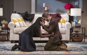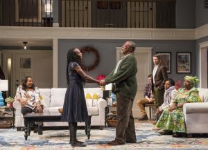 [rating=4]Dealing with families and their customs and traditions is not always easy for an outsider. In Danai Guirira’s comedy, “Familiar”, now on the main stage at Steppenwolf Theatre, we have a mixed marriage and are privy to the day before the ceremony is to take place. We are in a beautiful suburban home in Minnesota, 2011. The home/set (Kristen Robinson, you are a genius) appears to be a working home with kitchen, bathroom and space. This is an upper-middle class family with all the trappings that come with that status. The family is a Zimbabwean-American and although they are living the American life, their homeland tugs at their sleeve on this occasion. This is stronger in Donald (deftly handled by Cedric Young), who keeps trying to put up a memory of Zimbabwe where his wife , Marvelous (the always incredible Ora Jones) has a wreath. Oh, yes, it is winter and of course in Minnesota, snowing.