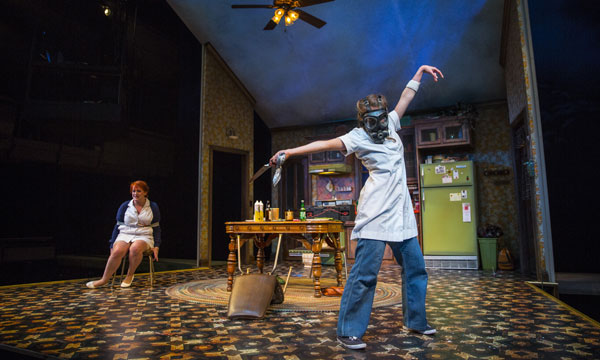 The other characters in this show is the nerdy neighbor Hugo (a funny performance by Jordan Brodess, who has nerd down to a “T”), who it turns out has romantic ideas about Chris. Is this play a thriller? Is this play a horror story? Is this play a farce? Is this play a monster story where the monster is not in reality the monster that ends up in the crawl space and then the walls? I certainly do not want to ruin the mystery of this story by revealing more than I must, but it is a play full of surprises. Some will feel right! Others, not-so-much!. As I stated earlier, the set is divine and the actors are all top-notch. The direction is smooth as silk given the material and despite this being a work that was developed at The Goodman two years ago and was designed to allow something different for their stage, in my opinion there is still some work to be done, so that it will appeal to a larger audience.