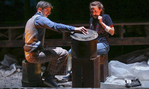 Let me explain this. I love the Goodman Theatre and what they bring to Chicago. I think that Smith had a novel idea in creating this story. A sort of “The Brady Bunch” meets “Little Shop of Horrors” and that Godinez has assembled a solid cast of actors including that amazing addition of the “Foley Artist (Carolyn Hoerdemann in action is worth the price of the ticket alone). The “Foley Artist” is the sound effects person as in old radio shows, making us hear things that are really not happening. The story takes place in the home of Arthur (deftly handled by Eric Slater) and his teen-age daughter Chris( a powerful performance by Olivia Cygan). Arthur’s wife, Ellie ( who we only meet as a shadow- Ali Burch) has recently passed away and her nurse, Carol ,now Arthur’s live-in fiancée (played to perfection by Christina Hall) may have some shared secrets with Arthur.FTThumb_01