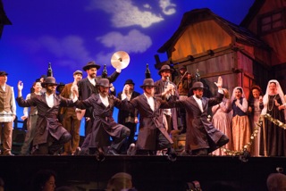Cahn Auditorium is a perfect venue for this large and ambitious production. It is skillfully directed and strongly choreographed by Rudy Hogenmiller who deftly transitions each musical number and scene, while effectively and wisely managing this large troupe of cast members. The music, directed and conducted by Roger L. Bingaman is beautifully performed by a twenty-three piece orchestra . The set by Adam Verness is really quaint and captures the essence of a turn of the century small town in the hinterlands of Russia. The costumes by Jesus Perez and Jane DeBondt are perfect and the lighting by Andrew H. Meyers is excellent.
