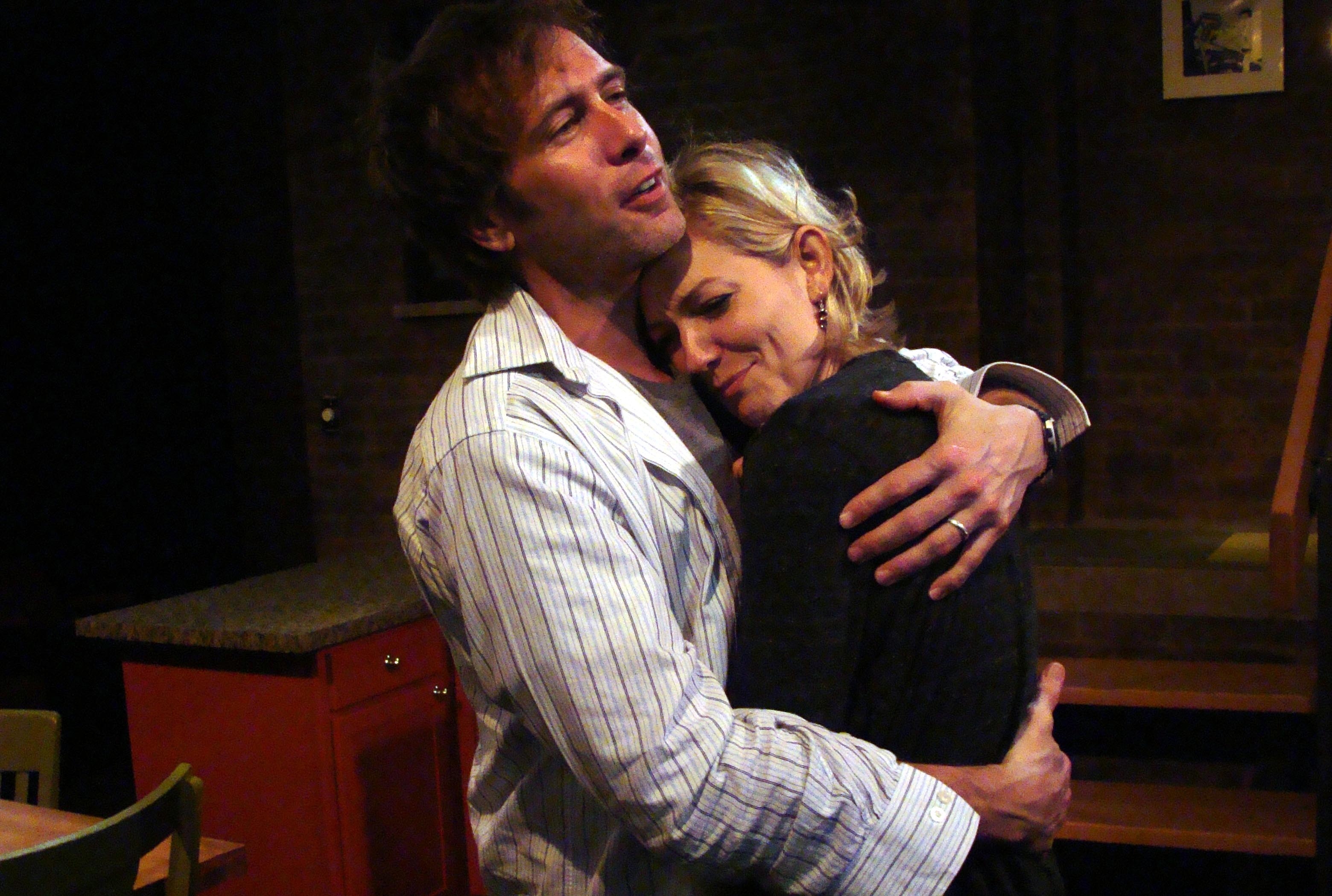 On this night, a lot comes up and what starts out as a wonderful, romantic night without a child at home turns into an evening of turmoil, hate, passion, truths and possibly in the end, hope and love! Directed by Joe Jahraus, who it appears truly understand what it is Weller is expressing, he gets the best out of both actors and their talents. The story is a bit contrived in that so much can happen in so short a time and two very angry people are able to ride that roller coaster to what appears to be a redeeming conclusion as their troubled son leaves the sleep-over early to come home. For those of you who know Profiles, you know that this is one of the smaller store-front theaters in town and thus very intimate(almost as if you are in the room), so when an argument happens and things are thrown about, be alert, you could easily end up with a bottle of ketchup hitting your leg as it bounces off Adam! The set by the way ( the action takes place in a kitchen, as a lot of their plays do)designed by Thad Hallstein is a workable one with a staircase leading up to the bedrooms and what appears to be a working kitchen. The lighting ( Lindsay Lyddan) works and the sound/music by Jeffrey Levin seemed to be okay once they got the opening track to be on target. This is the only real glitch in what otherwise was a flawless and energetic production. Technical problems in a small low budget production, in particular on opening night are forgiven. Cory Weinberg, the prop-master, truly has the hardest of jobs, in that there are a lot of props that need to be replaced on a regular basis. I would think their prop budget is one of the larger line items.