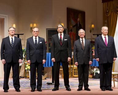Highly Recommended ***** On entering the Milwaukee Rep. Theatre’s house, one is struck by the elegant set (Todd Edward Ivins) where the five living Presidents, the most exclusive club in the world, will gather for the funeral of Richard M. Nixon, in Rick Cleveland’s play “Five Presidents.” As we see the presidents enter, we are stuck by the excellent costumes (Mary Folino) and make-up (Lauren Wilde), each one is recognizable and looks so much like their historical or living counter-part that one is never confused about which president is which. All five figures have been parodied or portrayed before and each actor draws on these interpretations over the course of their performances, but brings something distinct, new, and real to their character. The main dramatic action of the play is who will give the eulogy for Nixon and what in the world will they can say. Ford (Jeff Steitzer) has reneged on his agreement to do so, refusing to “pardon him again.” Reagan (Steve Sheridan) wants to, but is suffering from increasing Dementia and the other ex-presidents have been told to keep him off stage.