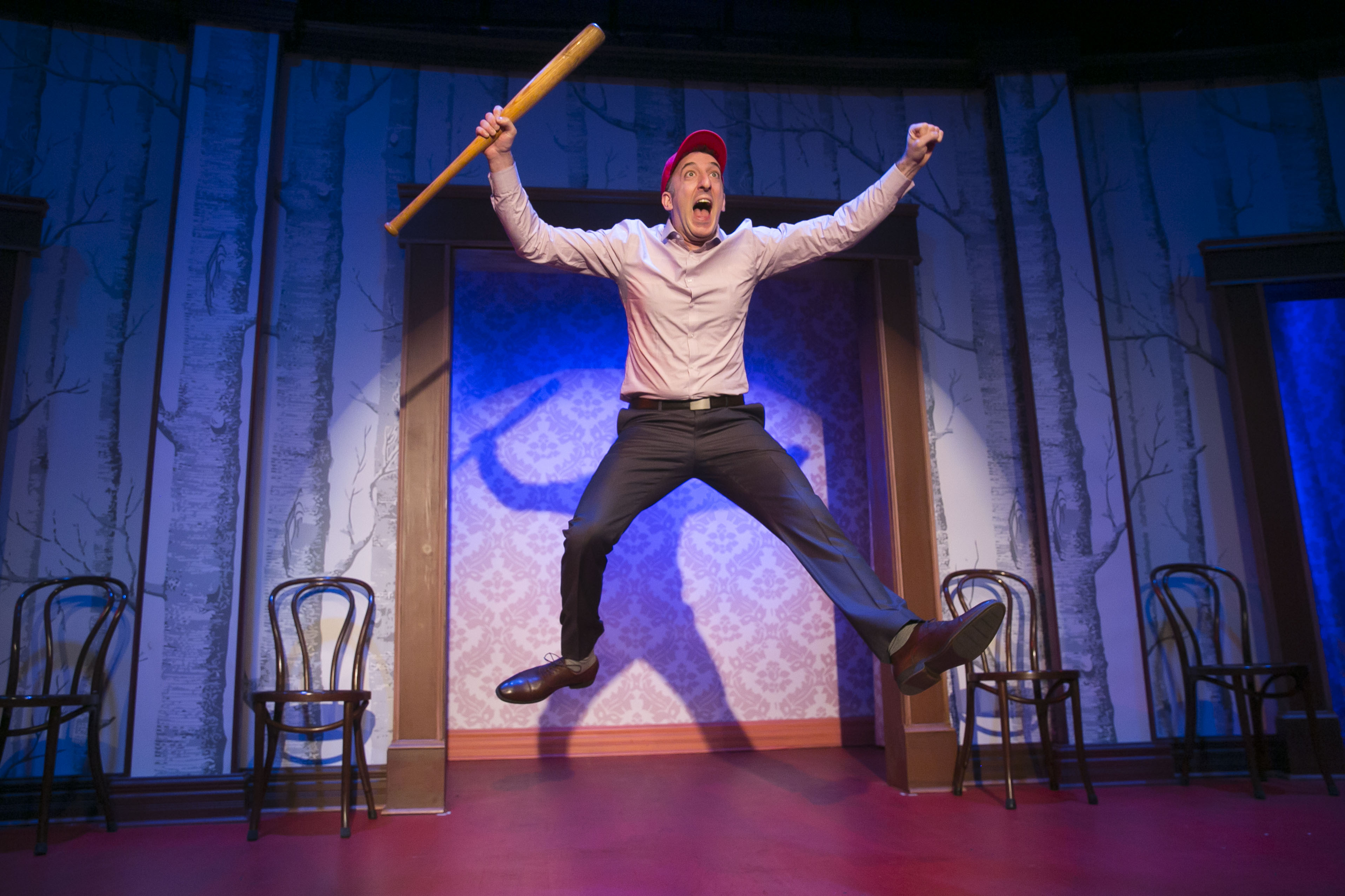 Sure, they improvise along the way and keep some of the material while other bits are scrapped. They also use the audience to bring us into the show, which also keeps those sitting on an aisle or front row seat, on their toes. Who knows when they might get called on! That is one of the highlights of attending their shows. You might find yourself IN the show and have a memory that will last forever. Director Ryan Bernier knows how to use the small stage with its many doorways to great advantage making every seat one where the audience sees the action. Jacob Shuda handles the music with his original work and sound and Greg Mulvey’s projections along with the lighting by Kyle Anderson truly makes this a bright evening of laughter.