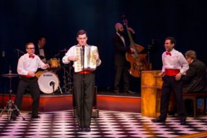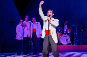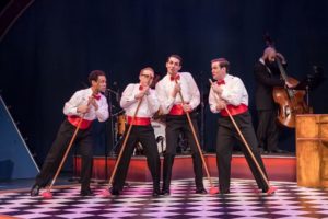 These solid performers are assisted by three musicians. Conductor William Underwood at the keyboard, Jake Saleh on bass and the incredible Nick Anderson on drums. They are truly great! The tech portion of the show is solid but nothing that special. Jessica Howe’s set is sufficient for the story being told. Brenda Winstead’s costumes are pretty easy as this is pretty well set by the script and the lighting (G. “Max” Maxin IV) and sound (Michael J. Patrick) are pretty easy to undertake. Frank Roberts does a superb job with gathering the props that they use for some of the numbers ( in particular the Ed Sullivan sequence) and I loved the plunger microphones early in the play. While this is not one of my favorite pieces, I took the ride out to Munster because they do solid work and found that they took an old and somewhat stale piece and put some new life into it with a solid cast of highly energetic and talented guys directed by a highly energetic talented director. Worth the drive!