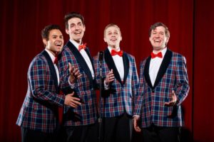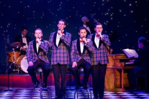 These four men ( just past being teens) are in Heaven and want to relate the story of why and how they got theirs. We meet the four talented young men; Sparky ( Matt Edmonds), Leader Francis ( Adam LaSalle), Smudge ( Christopher Ratliff, who will amaze you with his vocal range ) and Jinx ( the incredibly talented Yando Lopez, with a voice that will send chills down your spine). These are our heroes! These are the four young men taken down just as their lives were ready to become what they had dreamed for! Now they are caught between Heaven and the alternative wanting to get to the next level- to don those Plaid tuxedos they have ordered and be able to perform for a large audience of actual theater-goers ( oh, that is us, isn’t it?).