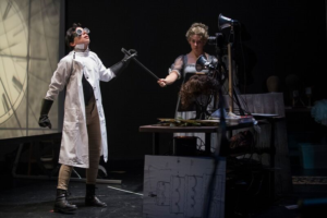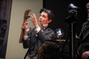 This adaptation of Shelley’s novel weaves her biography with a focus on birth, loss, humanity, and desire. The first part of the production lays the background for the story, how the novel came to be, and relies heavily on puppeteering, overhead imaging, and light boxes. The second part of the production adds actors, live and onscreen, as a silent movie, using subtitles, and, of course, terrific sound effects. It is difficult to act without dialogue, but Sarah Fornace, who plays Mary Shelley/Victor Frankenstein and Julia VanArsdale Miller, who plays The Creature/Elizabeth Frankenstein/Fanny Imlay, are excellent and up to the task. Leah Casey, Sara Sawicki, and Myra Su, in a variety of roles, provide fine support. Costume design by Mieka van der Ploeg give the actors the period look in each scene.