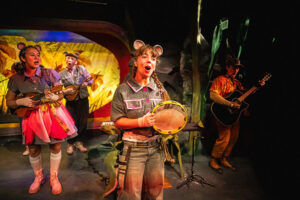 The story is about a sort of “family” as the seasons change and the preparations they must make for the changes. Directed to perfection by Tommy Rapley on a set designed Collette Pollard and built by by Lookingglass Theatre Scene Shop. The five performers truly hold the interest of the children and their parents ( and others, like grandparents) for the entire 65 minutes. The music is handled by the mice and Jeremey Weinstein. All the characters make the rest of the music. The costumes designed by Mica van der Ploeg were adorable and allowed us to view these actors as mice. Special recognition should go to Lonnae Hickman for the amazing props as the mice prepare for the season change. You will be amazed when the ear of corn is carried on the stage.