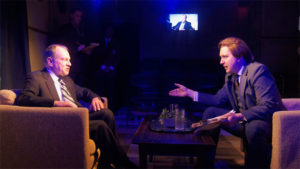 [rating=5]In these days of political “unrest” and all the constant “tweeting” and “fake News”, our thoughts often go back to another time, and another presidency, that of Richard Nixon and the famous ( or is it “infamous”) Watergate situation. Many recall the day that Nixon went on National TV to announce his resignation and the following interview of Nixon by David Frost. Redtwist Theatre is now presenting a very intimate stage production of Peter Morgan’s “Frost/Nixon”, a ninety minute re-telling of this special TV interview which many called a chess game between the truth and fiction; the Brit Broadcaster and the ex-president. In the long fun, the behind the scenes as presented in this charming play directed to perfection by Scott Weinstein, is one that you should find a way to see, no matter your political situation or party.