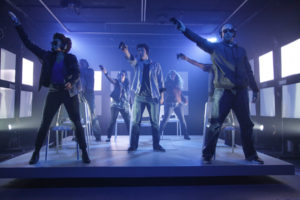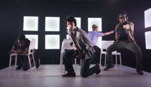 Coe has constructed a taut and suspenseful script which is smartly written and intensely compact. It seems quite clear that he worked very closely in collaboration with director James Fleming to ensure that the finished product is meticulously delivered. Fleming has done a remarkable job of taking information and data and presenting it in a completely innovative, visual style. Just watch how he handles the crisis as we learn that Tom must return home to visit his family in Kansas City when his father has become gravely ill, having the actor playing his father drag a white plastic chair around the entire periphery of the stage while actors are still performing upon the stage. Or how Tom shuffles through random voicemail and text messages from the gradually alienated to nearly ignored DC and Tom’s mother, father and younger brother Jack as the actors swirl around the four corners of the playing area. Much of the dialogue can overlap in certain scenes and the frenzied pace has moments when two actors are speaking the exact same dialogue in perfectly-timed unison. This is an immensely well rehearsed and cohesive unit of an ensemble. Chenard gives a sincere performance as Tom and has a natural quality on stage which makes him feel less of a monster than his character really is. Bakari is solid and enjoyable as Ekaterina, the confident partner who can go toe-to-toe when it comes to the verbal sparring matches early on in their relationship. Shannon is very sweet as the loyal best friend DC who almost becomes desperate for Tom’s affection towards the conclusion and also Musoni, who gets to play evil as Niko and young and innocent as Jack. Musoni handles them both adeptly.