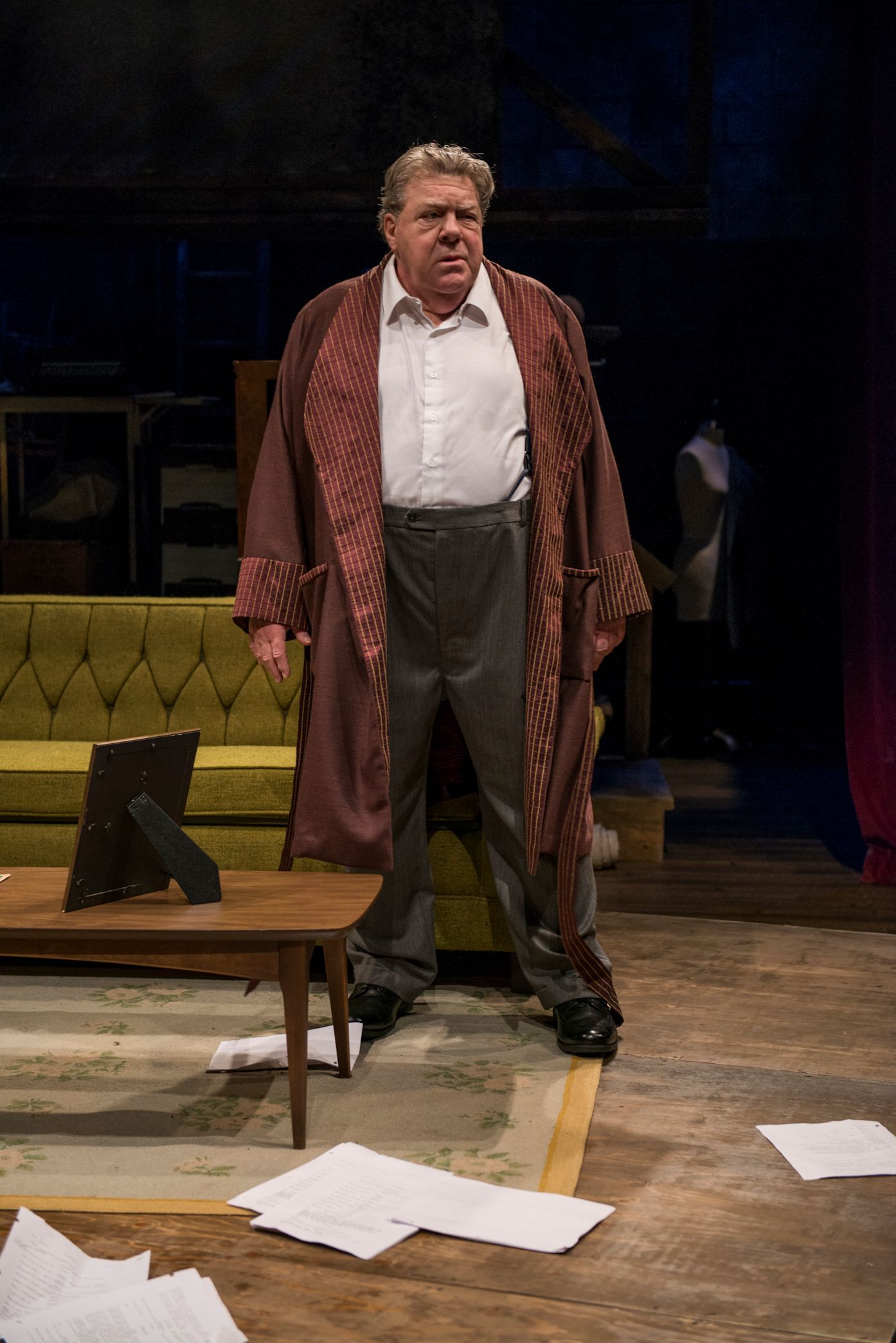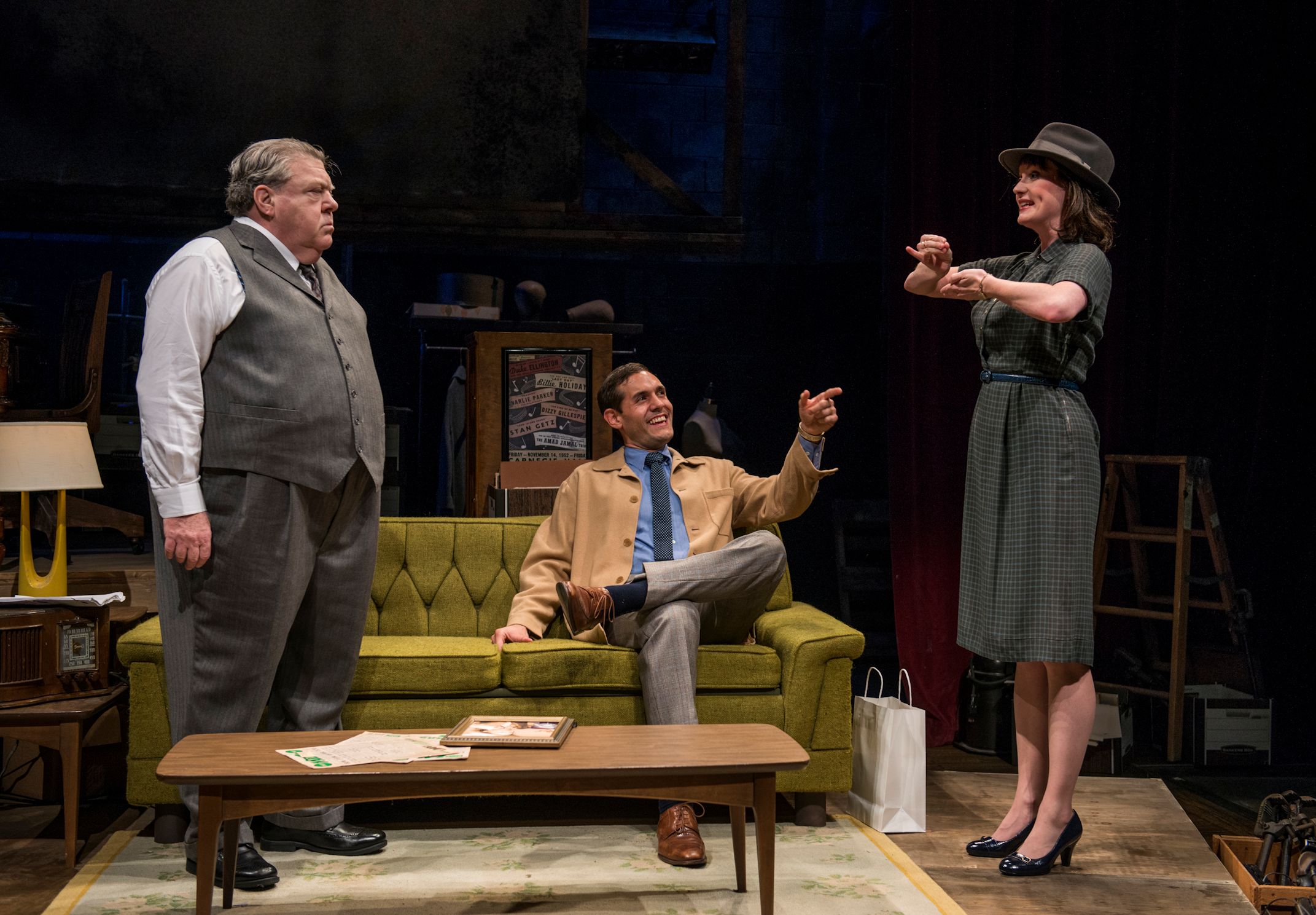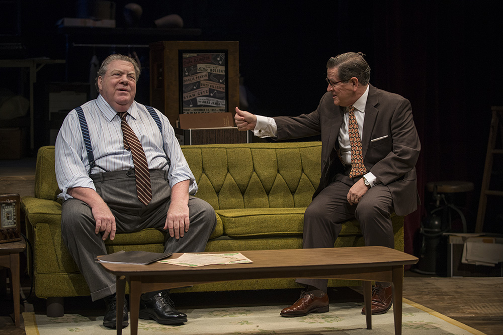 Going into this play, try to think about the differences between clown, comedian and comic. While all are on the stage to make us laugh, it is a fine line between what they do. The comedian tells us stories and does bits that have a punchline, the clown does silly things that are out of reality and the comic does more with sight gags and perhaps a trademark. Chick was known for his pants dropping sight gags and his “Yowzer”. Fans loved him (or hated him), but none could get close enough to know that deep down, he was a different persona than they saw on the stage. I was impressed with the set (Jeffrey D Kmiec) that allowed us to go between Chick’s home, Katherine’s workplace, Junior’s office and the small Off Broadway theater swiftly. The sound (Andrew Hansen), Lighting (Jesse Klug), projection design (Stephen Mazurek) and props( Kurtis Boetcher) completed the picture that Jones and Graham placed before us.