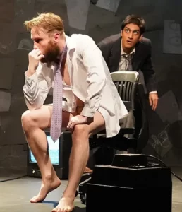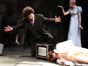 One of the devices that Truax uses throughout the play is to have the characters orbit around each other, both physically and by repeating their lines with slight changes in emphasis. It’s a neat way to show Galileo getting worn down, not only by the same objections, but by the trap between different gravitational pulls he has found himself in. Joan Nahid is a sinister Inquisitor and Gus Thomas plays the regal but unreliable members of the ruling class, but Dan Cobbler is a third antagonistic force as the personification of the up-and-coming businessmen who exploit Galileo and science in general. He’s funny and even charming, but equally dangerous. Another device is that many of the characters carry box TVs to indicate who currently has sway with public opinion, a smooth way of broadening the elitist world of a play in which the mood of the common people is often remarked on but mostly known second-hand.