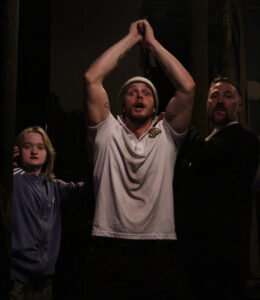 I liked Phoebe Hugget’s set design with David Flores’ graffiti on the walls, with one wall having the name Gangsta Baby written in pink on blue as a reference to Pete being transgender. The back of the front door is painted with a city scene, featuring a man sitting on a curb. I liked the inclusion of the functioning restroom into the play as well as real spray cans of paint, thanks to prop designer Alex Tuscanes, who also supplied the guns, knives, liquor bottles, and drags. Lighting design by Lex Newman is perfect for this show! Dialect coach Jason A. Fleece has done a nice job imparting the appropriate accents to all of the characters. Costume design by Jade Andrews works well throughout: The blood-soaked garments tell their own story when we don’t see the result of gunshots or stabbings as they happen in real time. Sound design by Zach Stinnett is accomplished well, especially in coordination with the lights whenever there is some sort of killing. I definitely want to make a shoutout to intimacy coordinator Christa Retka, considering all the close sexual contact in this production. Plus R&D Choreography did a bang-up job with the violence design, which occurs often and is plausibly well done particularly in the final fight between father and son. Finally, I really enjoyed the exercise segment just before the performance starts when we see Raasdal-Munro flex his strong muscles and practice his boxing jabs: We observe him pounding on a tall floor-to-ceiling post in the middle of the room, while seeing his finely crafted tattoos when he does his pushups. What great “eye candy” for all!