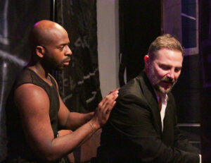 ** “Gangsta Baby”, written by Cameron Raasdal-Munro and skillfully directed by Rikki Beadle-Blair, is in its first U.S. world premiere, having played previously at the Hope Theatre, in London. The story centers on an abusive relationship between a working-class father and son, where Raasdal-Munro plays the lead in the character of Junior, a queer sex worker who has been making his own living in the working-class city of Hastings. Life goes on as usual until his father Senior (Josh Odor) returns to Britain from a job in Dubai and reintroduces himself to his son. Senior is a gangster, who would like others to think that he’s reformed from his criminal activity and is merely in the debt collection business. But now Senior wants to impose his will on his son and turn him into a person he’s not, that is, he wants Junior to go to college and become more successful than his father by rising into the middle class. Senior is a closeted gay man, and not only is he very upset that Junior has become a sex worker, but he is repulsed by Junior’s flaunting his sexual openness. The father uses the word queer to describe his son using the most negative nuance possible, for he doesn’t want Junior to appear effeminate in any way. Basically, the two men are of different generations: The father has to prove to himself that he’s being macho (in the sense of being a tough guy and beating up on people) so that he can use this as a veil to hide his gayness. His son, however, just wants to live his life authentically and express his sexual orientation openly.