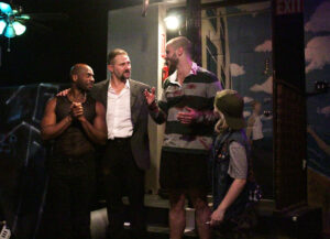 This is a sexually explicit and violent show about crime, drugs, homophobia, and queerness that’s close-up and personal in a 31-seat theatre. Get ready to hear heavy Cockney accents, all sorts of sexual and scatological terms, and a barrage of obscenities. I will also claim ignorance about some of the uniquely British words being batted about in the mix. Moreover, be prepared for a story that’s not entirely linear, and this is where the choppiness sets in. Sometimes we see characters who were supposed to be dead (like Pete) suddenly come alive in a future scene and, in Mitch’s case, he comes alive only to become dead again. I couldn’t figure out if the intervening was a dream sequence or in someone’s imagination—or perhaps this person was meant to be a different character entirely. I also wondered whether the hanging towards the end of the show was meant to be some sort of retribution on a higher plane of existence. There is a lot for the audience to take in and to imagine, and too many portions are unclear.