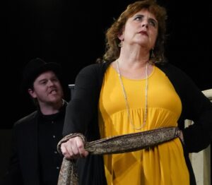 The cast of 8 are pretty much on the stage for the entire production ( and five of them for 20 minutes prior to the play starting). Watch them closely as you enter the theater. If you do, you might get a hint of their stories, as each one has their own reason for leaving. The actors are Marzena Bukowska ( the cat lover) Dan Cobbler, Jen O’Connor, Nicole Garneau ( who shows us many ways to die and is an actress with a story to tell), Emma Mansfield ( who looked to be less involved, but turned out to have a story that will make your hair curl), Manuela Rentea( the Housewife, who has a very sexual scene as well as one where she prepares Borscht for the other ladies), Gus Thomas and James Wheeler. There were many scenes where they moved parts of the set, and in a few instances changed characters- they were all terrific!