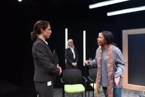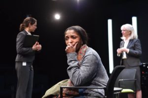 Recommended *** Watching the latest production of Remy Bumppo, the U.S. Premiere of “Hang” by Debbie Tucker Green , I found myself captivated by the three women who are indeed the characters that make this play work. The three women are on the stage of the downstairs Main stage at The Greenhouse Theater Center for approx. 85 minutes of non-interrupted story telling. The time is “nearly now” and based on their accents and the story itself, I would have to imagine that we are on English soil. Woman 1 ( an incredible performance by Eleni Pappageorge) and Woman 2 ( Chicago favorite Annabel Armour) have escorted Woman 3 ( deftly handled by Patrese D. McClain) into the room, which appears to be a government office of some type. They are asking her to decide on the end of a man’s life.
