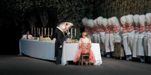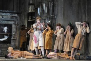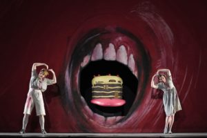 Hansel and Gretel is a very funny opera. It is also one that straddles the line between the fantastic and the mundane. The heroes’ house is drab and depressing, as are their regular costumes (both designed by John Macfarlane). However, everyone except Mother speaks in rhyming couplets, which are brilliantly translated overhead. Father is a good-natured drunk who attempts and fails to climb in through the window while in a jovial mood, although the family’s poverty gives this an unmistakably unpleasant undercurrent. In the second part of the first act, the play takes a sudden turn toward the darkly imaginative, as the children wander deeper into the Haunted Wood. The strawberries they smear on each other become ominous, but not so much as the spirits of the forest, including a Sandman (soprano Denis Vélez) who, from his mere appearance, nobody would be sorry to see trapped in a fishbowl.