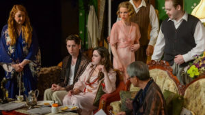 While the family members each have their own distinct personalities, the same cannot be said about their dates/lovers, who (except for gender, age, and appearance) seem to be remarkably plain, obsequious, and undifferentiated. The guests consist of Jackie (Melissa Brausch), Sandy (Robert Hunter Bry), Richard (Gerrit Wilford), and Myra (Elizabeth Wigley). The only authentic character in the play is Clara (marssie Mencotti), the faithful household servant who also serves as Judith’s dresser. Obviously, she is paid in her position and does her work well enough that she feels free to say things as they really are. (What a great performance by Mencotti!)