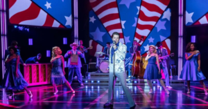 ( some of the accents made it difficult to understand the actors.) and the costumes Dustin Cross ) were truly the 1950’s ( I was a teen back then. I recall it all!). Daniel Brodie’s projections were powerful but sitting on the right side of the theater, some of the stage left projections were hard to see. When the show appears to be over, and many audience members rush to get out of the theater, DO NOT! The best part of the show is when Clendening and company let their hair down and do a 20 minute curtain call- “All Shook Up”, “Jailhouse Rock” and more. This segment is worth the price of the ticket alone and worth spending time watching the front story!