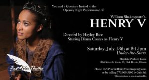 First Folio Theatre’s production of “Henry V” is playing outdoors from July 10 to August 18, 2019, beginning at 8:15 p.m., at the Mayslake Peabody Estate, 1717 31st Street, in Oak Brook, just west of Illinois Route 83. This is the last season on the original stage, which is being rebuilt in its entirety. After a hiatus in 2020, future outdoor performances are scheduled beginning in the summer of 2021.
