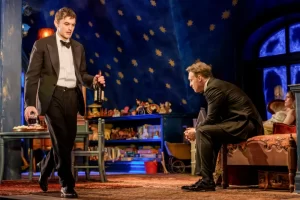 ***** For the first opening of 2026 for The Goodman , they have brought back a modern, refreshed, version of “Holiday” written by Phillip Barry as adapted by Richard Greenberg. Going back in time ( almost 100 years ago) it was a film by George Cukor and the perfect vehicle for Cary Grant and Katherine Hepburn. The story is quite simple. It is a love story that has a young man, who meets a young woman, while on a “Holiday”, and they appear to fall in love. Johnny ( deftly handled by Luigi Sottile) has no idea as to who Julia ( played to perfection by Molly Griggs) is the daughter of, but quickly learns that he may have bargained for a lot more than he thought.