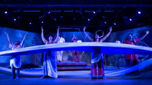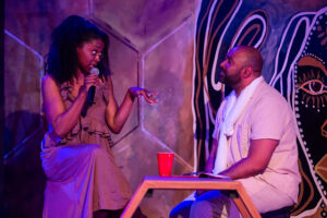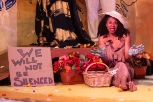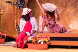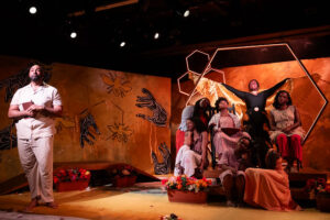 Here, the women are reimagined as denizens of a beehive, each going about their lives as members of a huge, diverse community. The set design (Rhoze and Kotryna L. Hilko) is awash in honey-colored, sponge-painted walls with large bees and hands dripping and oozing thick honey from fingers and honeycomb crevasses (Sholo Beverly). There is a neon-lit wooden hexagon framing the center stage as if we are looking into and immersed in a beehive. The design of the sets, the expert lighting (Josiah Croegaert), the sound and musical selections, including Bob Marley’s “Get Up, Stand Up” (Ethan Korvne), and the wardrobe selections (Hilko) brought this play to life and transported the audience into a fictionalized world. As implausible as this may seem, it works. The metaphor of the hive, its bees, and the sweet honey they create refers to the life of bees, essentially female-dominated communities with an occasional “drone” (a man) on an as-need-be-basis only. In my mind, the hive draws a parallel with Black women who toiled, enslaved in the fields alongside men, and, too, tended to the domestic demands of family life.