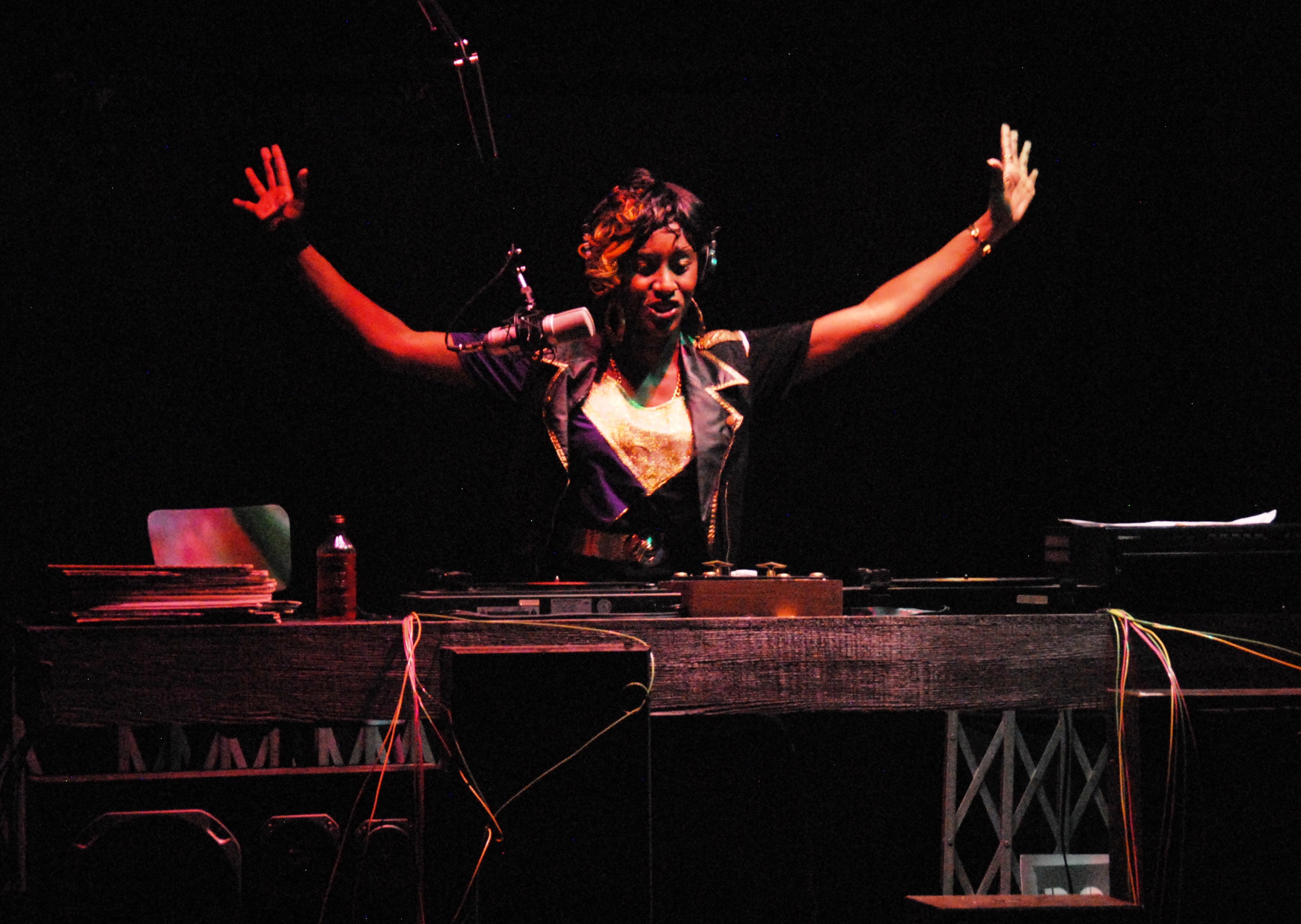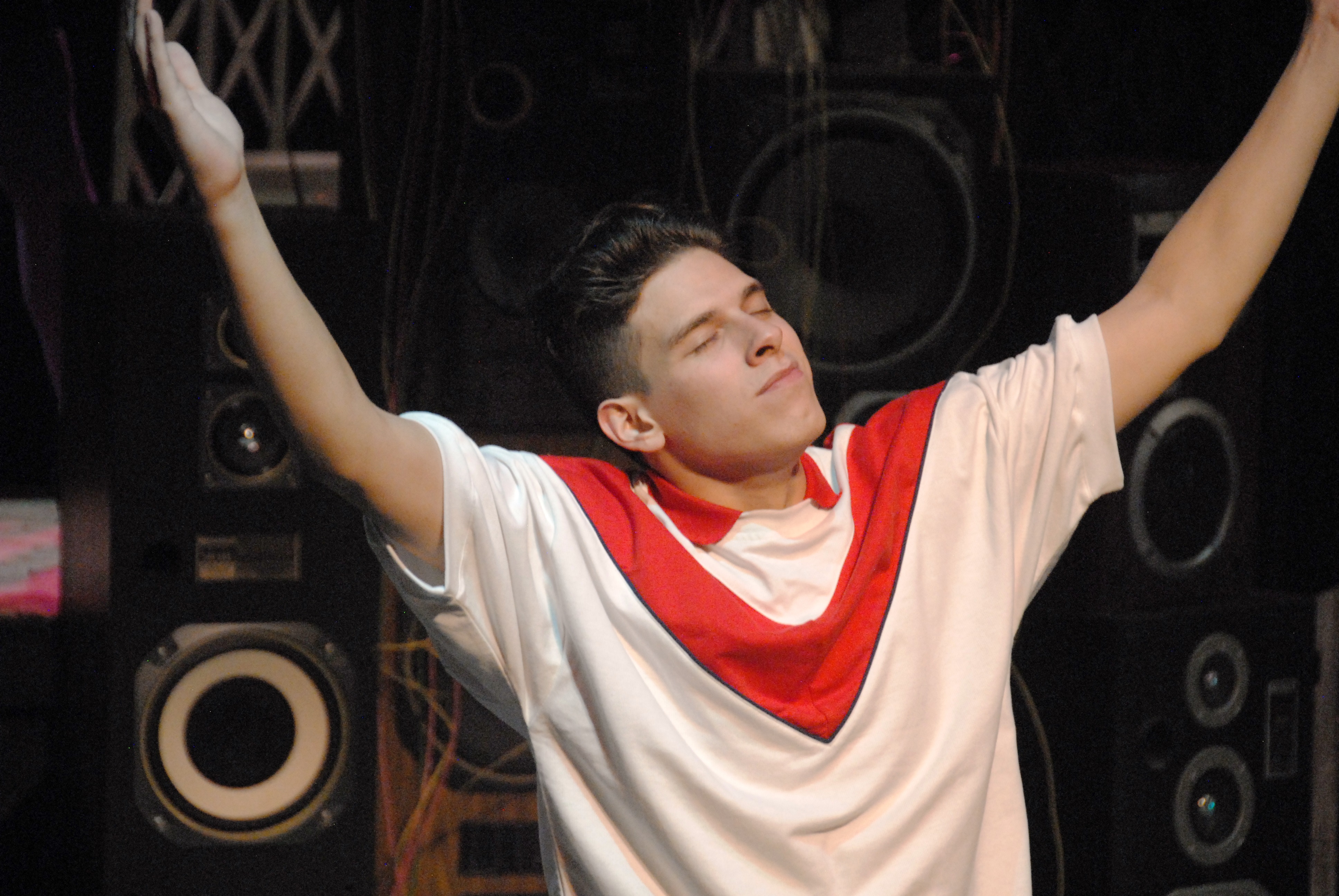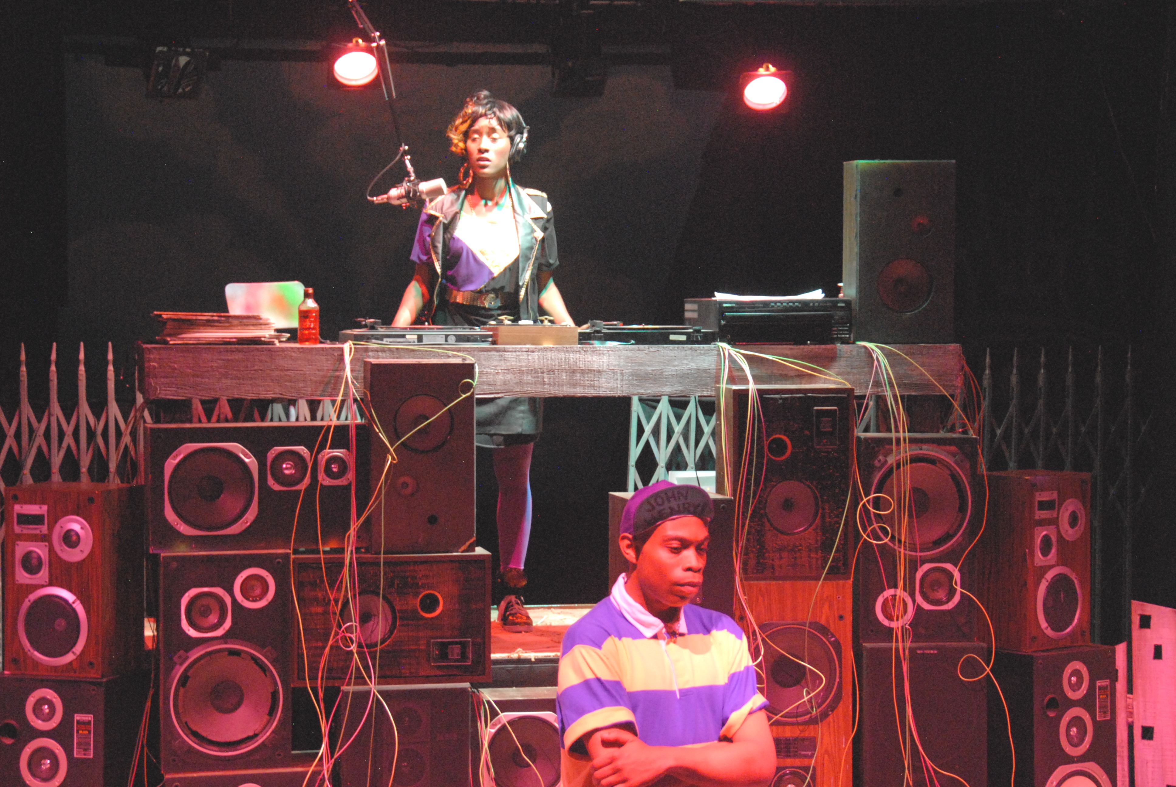 Citadel is a very intimate space and there is no curtain, so we see the set from the moment we enter the auditorium- this is a set made up of speakers and an upper level MC station ( A. J. Tarzian has kept it simple but practical). The lights dim after we listed to about 13 warm-up minutes of the music and in comes The selector, a charming DJ/MC played to perfection by Celeste M. Cooper. She is the power that makes this show truly special as she stands above the crowd, playing everyone that is not Hank, Julian or Luann ( another student who becomes the third voice as the boys find that they cannot do it alone).