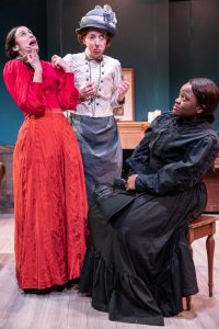 Costume design by Stefanie Johnsen captures the spirit of the era, not to mention the fact that the clothes themselves are beautiful. The task of designing apparel for this show involved mastering the details of the outer garments plus all the inner garments of that era, including bustles, corsets, underdresses, pantalets, stockings, drawers, and all other manner of underwear. Intimacy design by Samantha Kaufman and Maureen Yasko was essential for this entire play to come together as it should, considering the many intrusions on personal space with all of the dressing and undressing of the characters and the (inoffensive) application of the vibrator. The modesty of the late 1800s had to be respected as well as the sensibilities of modern theatregoers.