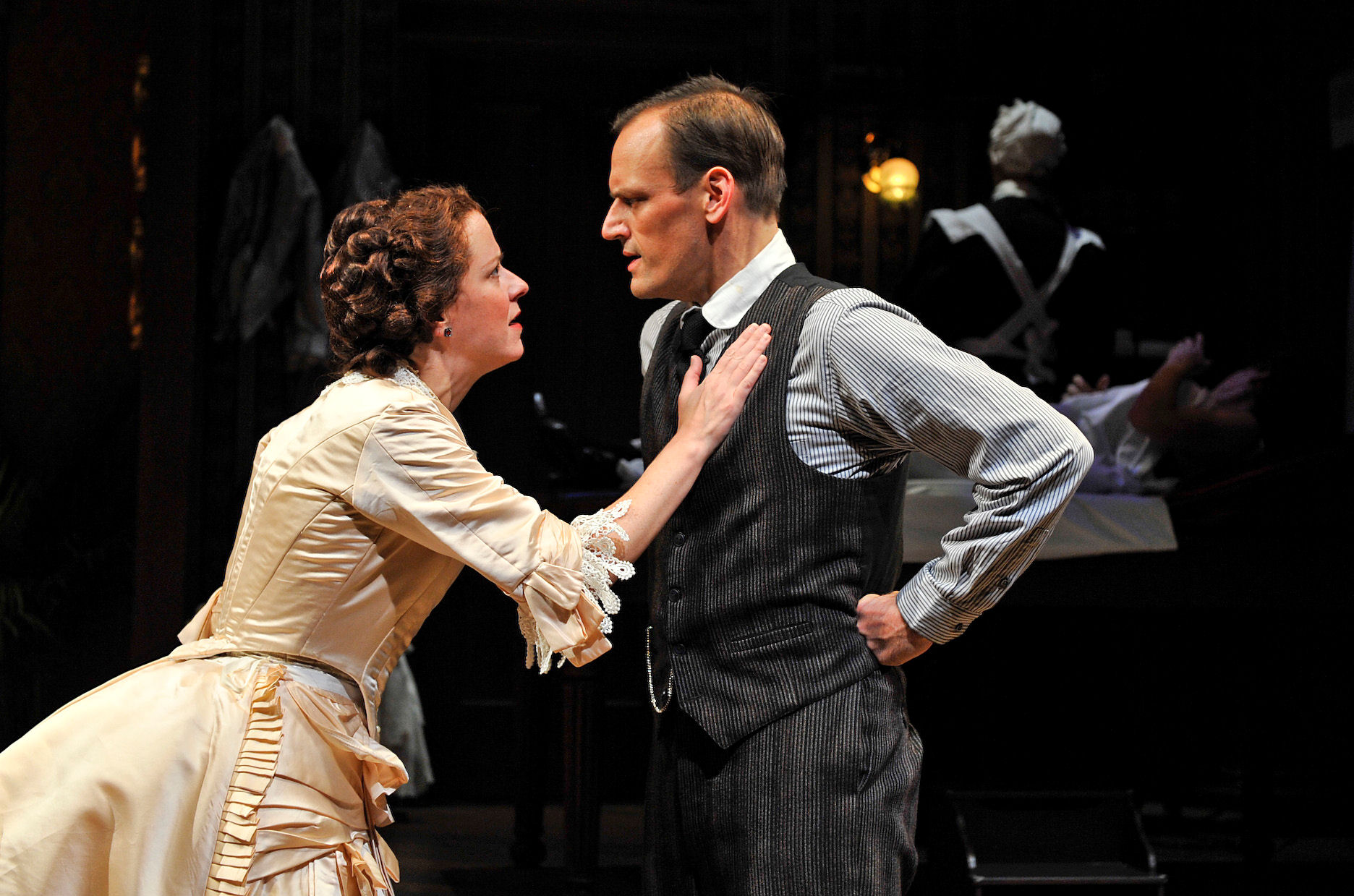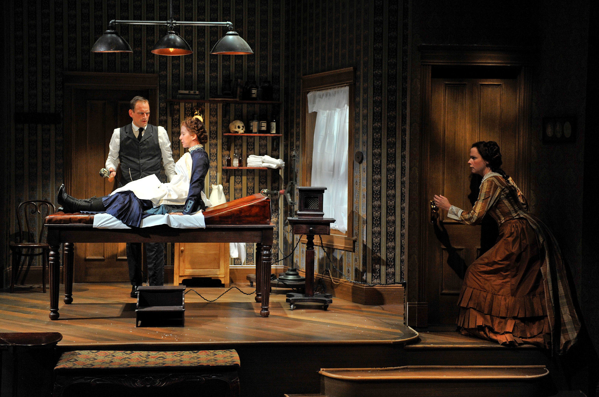 Shinner has a delightful cast in this fast moving comedy on a remarkable set ( Jack Magaw) that fills this small stage with a fantastik living room and a riser that is “the next room” ( where the doctor does his stuff). The Victorian costumes (Jacqueline Firkins) are magnificent and very detailed and the lighting (Joseph Appelt) sheer perfection. The sound design and music ( Andre Pluess ) were very fitting and even with a sound problem on opening night, the actors were able to carry their voices well in the beautiful, intimate Biograph Theater. Grant Sabin’s props are an important part of making this show work and the cast of players appeared to be having as much fun doing Ruhl’s script as we had watching them perform. Lawrence Grimm as Mr. Daldry, Joel Gross as the artists Leo Irving who also needs the doctors device ( but in a different way), the delightful Patricia Kane as the doctors nurse, Annie round out the cast. While there are characters of greater importance , as in most plays, this is truly an ensemble piece, as they all play off each other, and do so to perfection. Let Ms. Ruhl take you back to the Victorian Age in a slightly different way than you have ever experienced. You too, will leave the theater with a smiling face ( and perhaps your cheeks will be rosy as well).