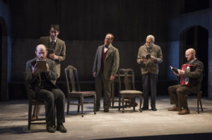 The cast includes David Darlow, Matt Deitchman (accordion ), Elleon Dobias ( violin), Cindy Gold, Noah LaPook, Benjamin Magnuson , Andrew White, Catherine LeFrere and Kiah Stern. Ms Stern and Ms LeFrere play the two females of the company who bring us the love of the two women and in a final scene bring a tear to one’s eye as we see the true feelings of these women. Each actor in this production plays a multitude of roles, and while you might get confused, if you focus on the storytelling, you will not have a problem with this at all.
