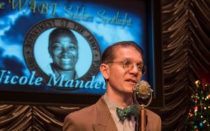 This is a 90 minute production that is treated like the old radio shows were. The actors greet and meet the patrons as they enter the seating area, asking them to fill out forms offering holiday greetings to others (in the audience or possibly listening on the radio). They warm us up with this and then holiday songs where the audience sings-along. They also do some songs and honor a military person ( this is a tradition of The American Blues Theater for all shows). They teach the audience about the “On Air” and “Applause” signs and do some local commercials. In fact the first 15 minutes of the 90 is used to get us into the mood. IT WORKS!