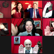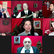 In this era of ZOOM, the production is set a little differently than in the past. While designed to have the audience feel that they are in an actual radio studio , circa 1944, where they will watch the actors bring this story to life, we are sitting in our own homes, as are the actors. The screen is filled with many boxes as we approach “curtain” and each of the actors is introduced as they join us. At this point we are kind of  greeting each other as Mike Mahler ( pianist, announcer and others) along with his wife, Dara Cameron(Violet and others) bring us some holiday music. They are together and have their home set up to resemble ( somewhat) a radio station. Since each actor is home, the actual radio station part of the production gets a little lost, but the production and performance far outweighs this .