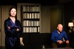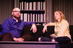 Sharply directed by Josh Johnson, who utilizes the small stage and intimacy of the Oil Lamp to perfection, the “fourth wall” is eliminated. We are the “fly on the wall” and don’t be surprised if audience members become a part of the production. This is a clever and highly comical story. A man loses his first love, mother of his daughter, remarries and then finds that he is still deeply in love with his dearly departed and cannot go forward. Add to this that his second wife is climbing up the corporate ladder and despite loving him, they lose that “flame”. Jake’s imagination brings up all of the women in his life. Even his mother ( but she is only by anecdotes).