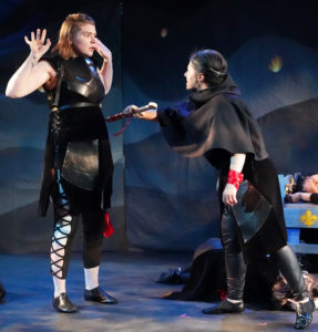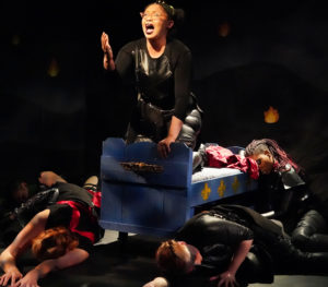 Joan’s telling of her tale is heartbreakingly earnest. The earliest point at which we see her is when a monk leads her across a recent battlefield on her way to present herself to the Dauphin. These sights of carnage have been common in France for a hundred years but are new to her, as is the despair and casual cruelty of a thief she encounters (Lauren Fisher). And yet, this person is also the first one she brings hope to. The Dauphin (also Pinson) is hilariously unworthy of her loyalty, but going through a crisis of his own over whether he even is the rightful heir, and Joan’s intervention is framed as redemptive for him, as well. Joan eventually shares with him her childhood playing with the spirits of the forest (Emily Lotspeich) and she pictures the English leader, the Duke of Bedford (Manuela Rentea), as an evil overlord who entertains himself by tormenting his pet rats. All of this is played very sincerely, with Richard Norwood’s richly colored lighting maintaining a mood of awe along with Rockett’s music and Jeremy Lawrence’s poetic translation, but death and loss are ever-present. The personification of Death even appears in person to lead the people of Orleans in a danse macabre as they expect their city to fall to mercenaries who will be paid in plunder, and demonstrates why they would be desperate enough to want to believe in an unlikely savior.