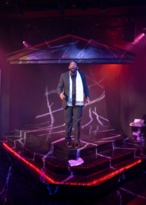 This is 90 amazing minutes that we will spend meeting four men. They are of all ages and backgrounds. What they do share is that they are Black and that they are dead. Yes, we are in what is a waiting station (designed by Ryan Emens) where we see a teletype machine ( this is sort of like a fax machine) and a bare stage with what appears to be a slide leading to nowhere. Isa ( played to perfection by Kai A. Ealy ) is alone and for a period of around 15 minutes we watch him and he watches us. It appears that this is a landing station or purgatory and at this time the next steps are up to a higher being.