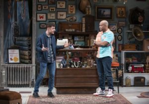 After intermission, we are treated to a second round of music by DJ Khloe Janel, located in the balcony box to the left of the stage ( as we face it from the audience). This is done at the start of the play as well. As Act II begins, the entire stage revolves taking us from Matt’s Wine Bar to his parents shop ( the sets by Todd Rosenthal are a work of art) and the props are absolutely amazing (Bren Coombs, Danielle Moyal). Directed to perfection by Kenny Leon, Rajiv Joseph’s script is amazing and understandable even if you are not a basketball fan. In other words, you don’t need to know the game, but it does help if you understand how sports can bring men together.