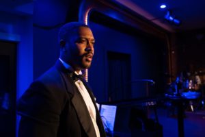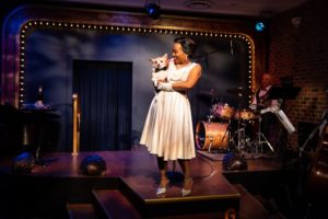 The performance is jointly directed by Roston and Christopher Chase Carter, who use the backdrop of a cabaret venue to its maximum. Scenic designer Johnnie Schleyer has done a fantastic job with the authenticity of the set. “Lady Day at Emerson’s Bar and Grill” takes place in an intimate setting consisting of a room laid out with round tables seating parties of two, three, and four people each. There is a stage and musicians upfront, and a full bar and a mini-stage in the back of the room, where the sound mixer is located as well as the bartender.* Lighting designer Denise Karzcewski and lighting supervisor Rachel West have created a splendid mélange of lights and lighting changes, corresponding to the stories that Holiday relates to the audience and the mood of the various songs. Costume designer Samantha Jones has dressed Roston in a white ballgown, which works very well when lights shift color and the spotlight is engaged. Sound designer Carl Wahlstrom must be commended for such a great setup! At one point, Holiday brings her treasured dog underneath her arm, a chihuahua named Pepe, dressed up in a bow tie but clearly uncertain about what was happening around her.