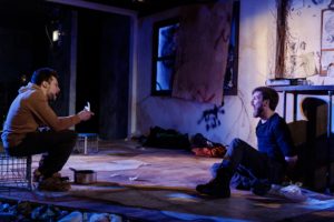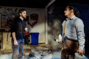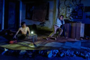 Director Ismael Lara, Jr. does a great job utilizing a very small stage in a venue with only 63 seats. We see a functional set, mostly meant to look like a safehouse, nicely designed by Mara Ishihara Zinky. The borderlines of the set are meant to depict the outdoors. Lighting by Josiah Croegaert essentially demarcates the various spaces and the time of day, such that the scenery—and cinematography—is left to the audience’s imagination. Sound by Joe Court is perfect, and costumes by Johan Gallardo are very appropriate. Props are good, and one of the most important of them is the pot inside the safehouse, which the brothers use to boil dirty water, so as to be able to drink it without getting sick.