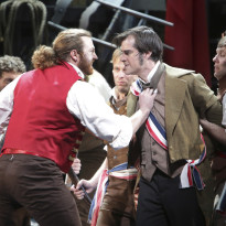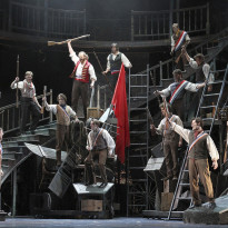 Let’s start with the stage. The Paramount has a high ceiling and instead of doing a normal turntable as done in New York and Chicago productions, Kevin Depinet and Jeffrey D. Kmiec have built an amazing wall and staircase unit that turns and converts to exteriors and interiors as well as becoming a part of the “barricade” in the second act. Not only is it effective for the opening scene (setting the tone for the entire production), but has been used to work with every scene. Bravo to the genius of the director and his tech people!