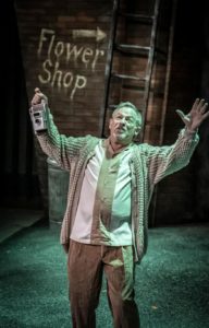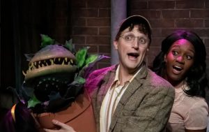 [rating=5]Citadel Theatre’s season-opener musical about the plant that everyone loves to hate delivers a knockout punch for an entertaining evening or afternoon. From the moment one walks into the theater, Scenic Designer Eric Luchen’s slightly cockeyed set indicates that something screwball is about to happen. (He is assisted by Scenic Artist David Geinosky.) Cindy Moon’s costumes are almost cartoonish but never over the top, evoking a mash-up of sixties-through-eighties fashion trends. Particularly clever is her evolution the of costumes of three girl trio, Chiffon, Crystal and Ronette, who start out poor on “Skid Row” (just as flower shop employee Seymour does), and then become a sort of Greek chorus as Seymour’s fortunes improve. Starting out the show in schoolgirl plaid, they evolve into matching gowns a la the Supremes. Moon makes sure to tweak the costumes in some way for each chorus member so that she is distinct.