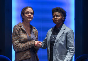 Scenic design by Jack Magaw is relatively minimal, mostly consisting of venetian blinds in the four corners of the room, above which are tall platforms, where some of the characters might speak from. Levi Wilkins has great lighting throughout this show, especially the lighting of these blinds and platforms. Projection design by Smooch Medina is perhaps what is most noticeable and interestingly done. There are ten squares on each of two opposite walls of the room, where the video is being projected. We initially see the street sign “London Road” right-side up—and it turns 180 degrees when the community is in turmoil. Following that, the projections of the city throughout the show are intentionally shown upside-down, to reflect the fact that the people’s lives have been turned upside-down by this crime. The introduction of a video camera to show live newscasts and interviews with community residents adds contemporary touch of immediacy. I especially liked that the audience got to see the black and white photos of the five sex workers who were killed. Austin Winter’s costume design works well in that some items of clothing have been measured and designed in centimeters rather than inches! Sound design by Christopher Kriz is perfect, and props design and scenic change by Shayna Patel could not be any better. Above all, without Sammi Grant’s dialect coaching, we would have no show, since the setting is in Britain, and the community members largely speak with cockney accents.